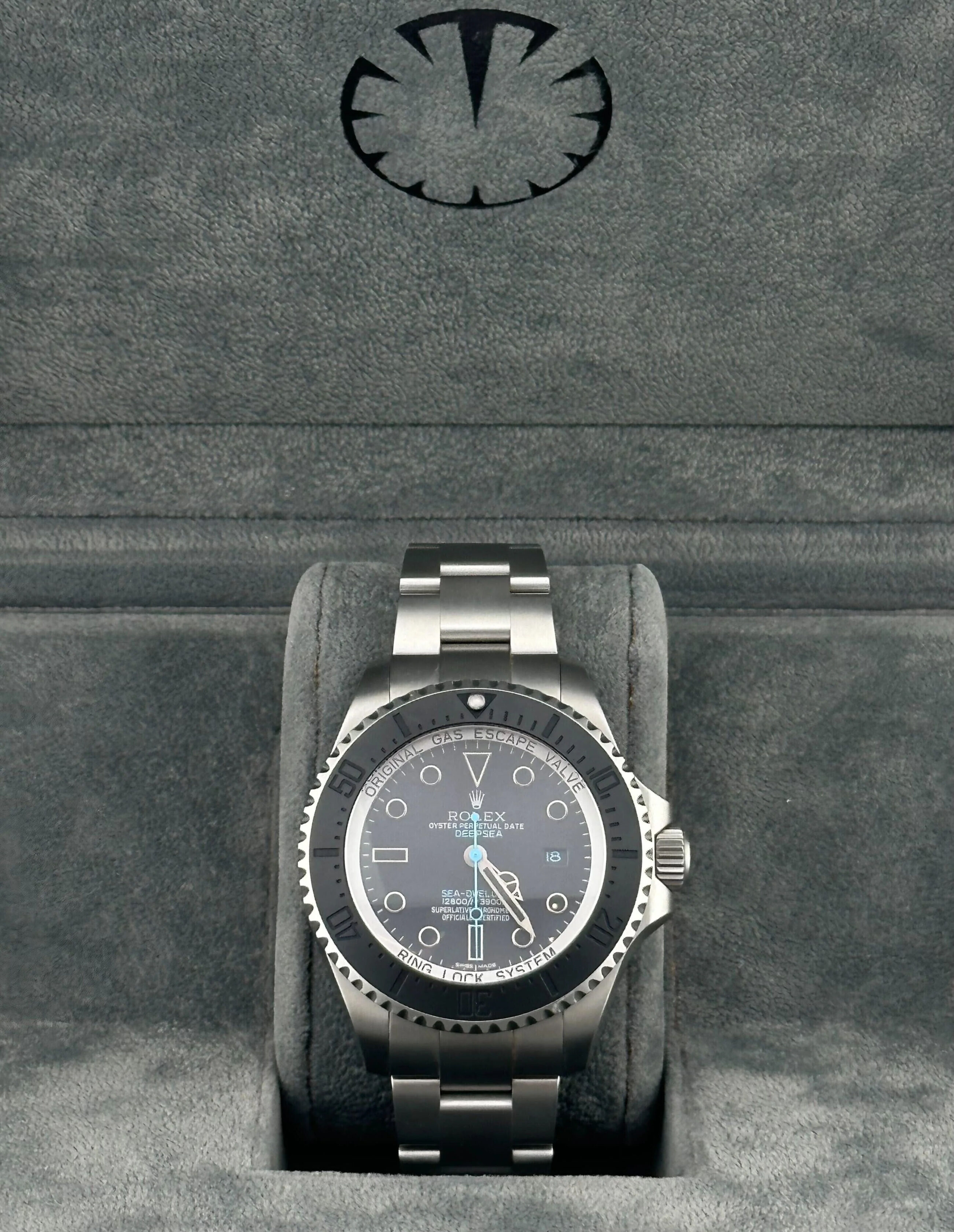 This special edition release model Rolex Deepsea Sea-Dweller is crafted in an 44m stainless steel case. matte black bezel. and a black dial with blue hands. Chromalighthour markers and handsare with luminescent material for maximum timekeeping efficiency above and below the surface.