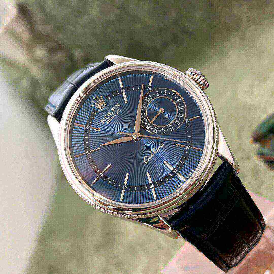 Rolex Cellini Date White Gold Blue Dial Mens Watch 50519. Automatic self-winding movement. Officially certified Swiss chronometer (COSC). Paramagnetic blue Parachrom hairspring. Bidirectional self-winding via Perpetual rotor. 18K white gold round case 39 mm in diameter. Rolex logo on the crown. . Scratch resistant sapphire crystal. Blue sunburst guilloche dial with white gold baton hour markers. Fine printed minute/seconds track. Pointer date subdial at 3 o’clock. Black leather strap with an 18K white gold tang buckle.