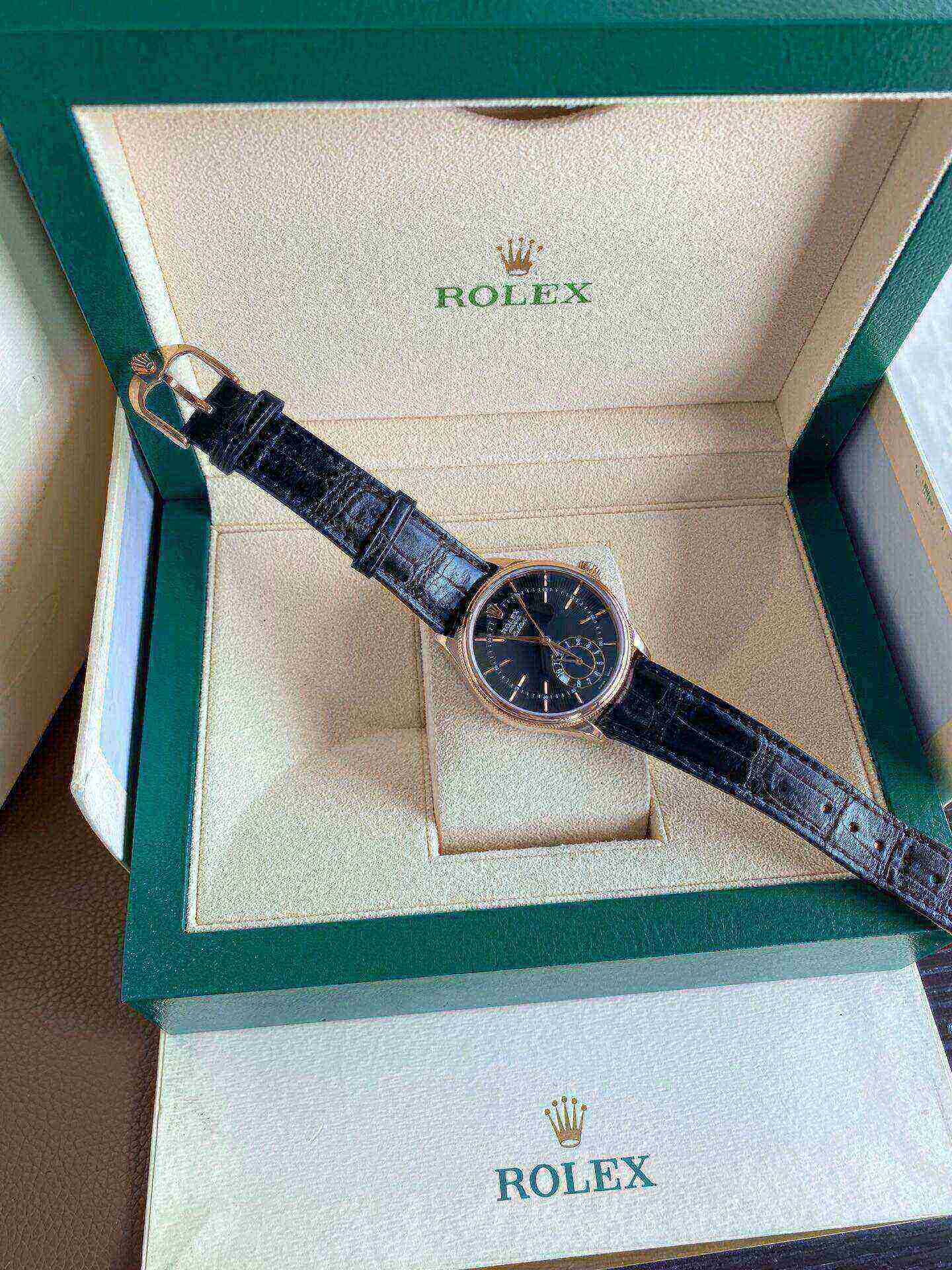 Case: 18K rose gold round case 39 mm in diameter. Rolex logo on a crown.